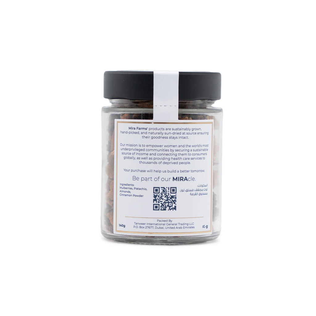 Roasted almonds, pistachios, and mulberries dusted in cinnamon and coconut sugar—your afternoon tea’s new best friend. Packed in sustainable jars, this blend offers a cozy balance of warmth and crunch. A sweet twist with depth.