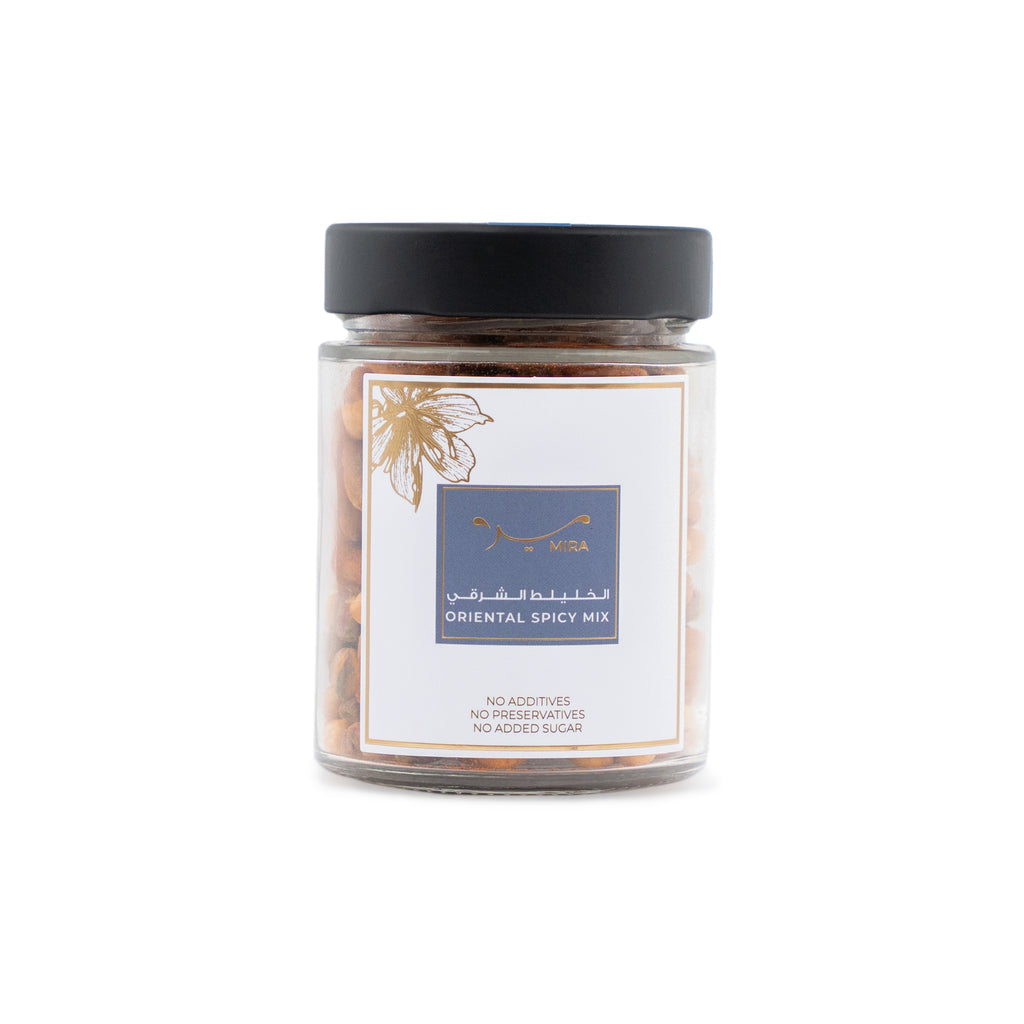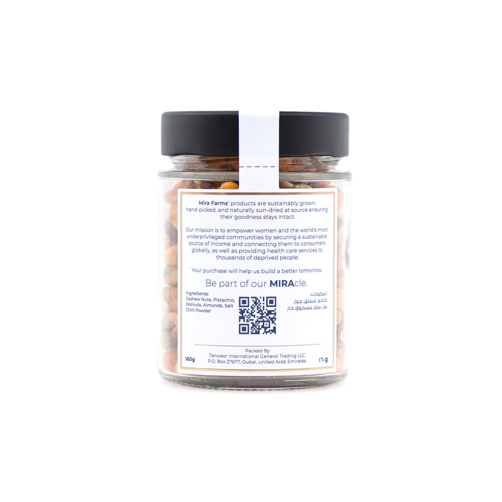 Heat meets crunch in this mix of roasted nuts and raisins, tossed in ground red chili and packed in eco-conscious jars. Ideal for spicing up your snack routine or serving with a cool drink. Bold, exciting, and unforgettable.
